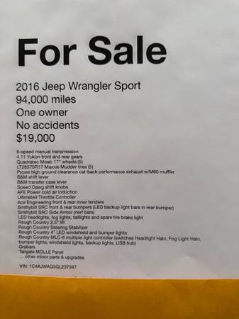 94,000 miles. One owner - no accidents. Many modifications. Please see fact sheet in photos for details. Manual transmission. There is a back seat - just not in place in pics. 2 door. Hard top.