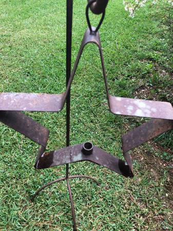 Standing about 5 feet tall. Unique standing star with candle holder. A rustic flavor of decorating. The shape of a star is very defining for Texans and many others. Candles are always in style with everyone. The very tall standing piece of artwork.