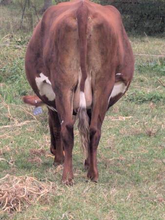 Produced 7 and 1/2 gallons of milk daily her previous dairy, near beginning of current lactation which is her third, I believe. Currently around 5 years old, very sweet, a little more shy than our other girls. We have had her for 1 and 1/2 years. Currently dry, just Al'd to Jersey so selling as exposed. Price reflects that. Easy to hand milk, or machine. Just got back test results for Johnes (negative) and BLV (low shedder positive), forgot to send in correct vial for BVD but negative last year. She has been grass-fed since we got her her and done well, but I'm sure she would also do great back on grain. Message with any questions!