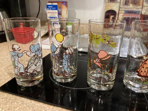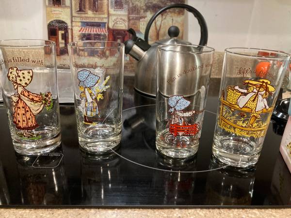 Vintage Holly Hobbie Glasses (set of 7) from the 1970's.- $25 for set American Greetings Happy Talk Set These are in very good condition.