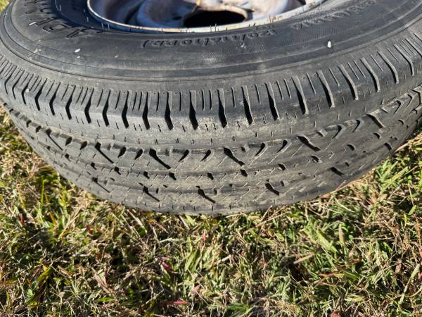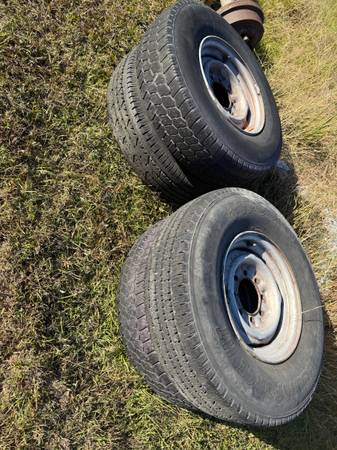 Good used set of 4 tires and wheels off of a F250. 8 lug steel wheels off of a 1989 F250 89 and is 8X6.5 inch bolt pattern. Tires are good and are 235/85/16. Good for a work truck or trailer. Mounted and balanced and ready to bolt up.