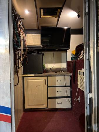 Inside you have cabinets, mini fridge, tv, and working ac unit.