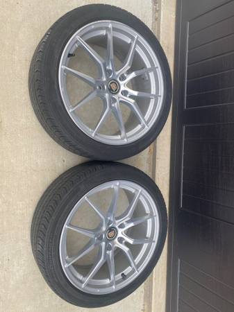 I have a pair of Cadillac CT4 tires and aluminum wheels. Continental Pro Contact tires with plenty of tread left size 235/40/18. Mounted and balanced and ready to put on car. One wheel has a little scuff on it (look at pics) but is not noticeable. Located in Clinton, MS.